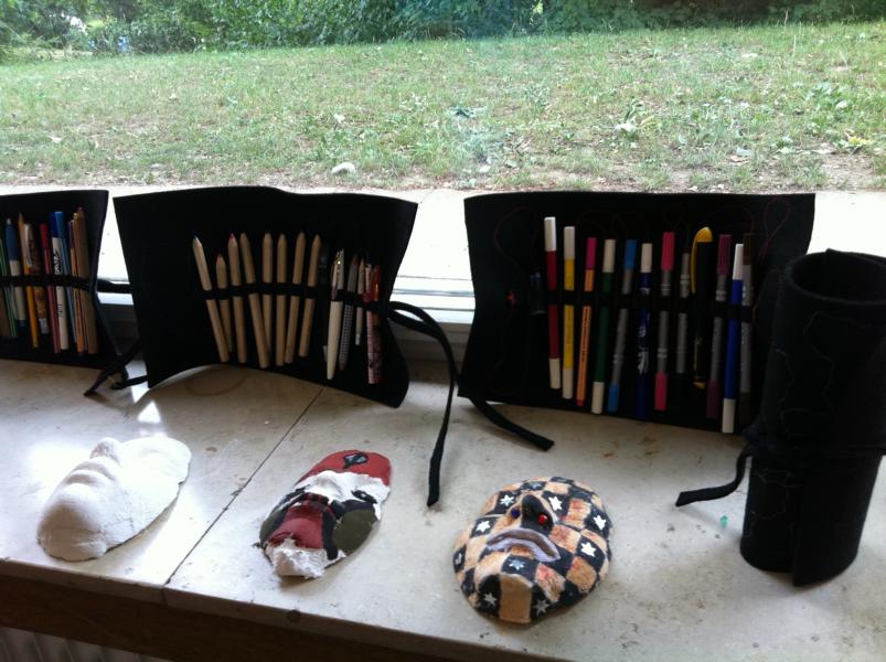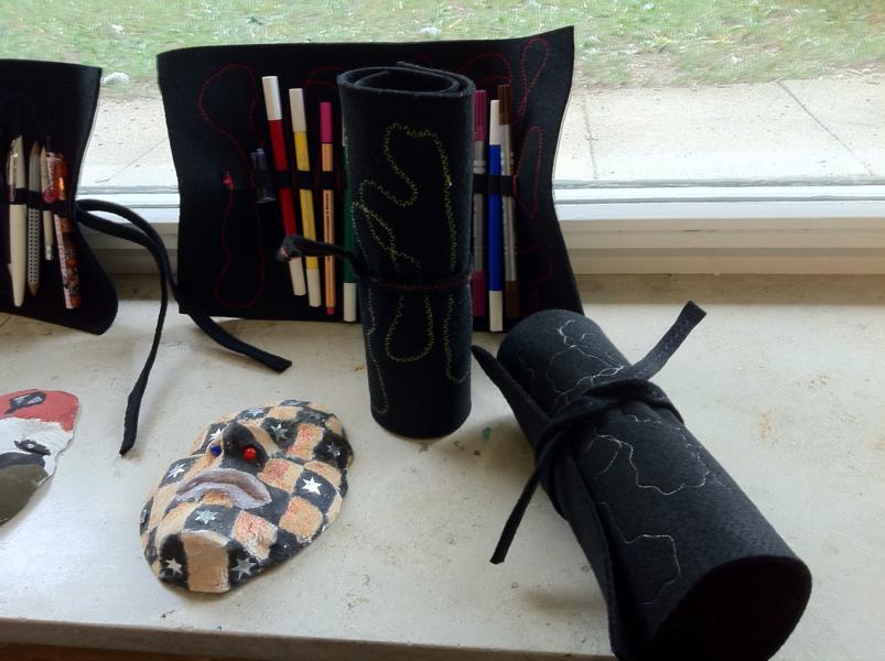 Diese wurden auf Folie kopiert, mit Hilfe des Overheadprojektors auf Packpapier projeziert und mit Acrylfarben ausgemalt.