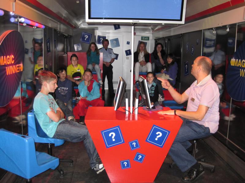 In 90 Minuten wurden die Jungen und Mädchen der Klasse 5/6 durch 5 Eisenbahnwagen geführt. Sie wurden auf sehr anschauliche Weise mit den richtigen Verhaltensregeln an Bahnsteigen und Zügen vertraut gemacht.